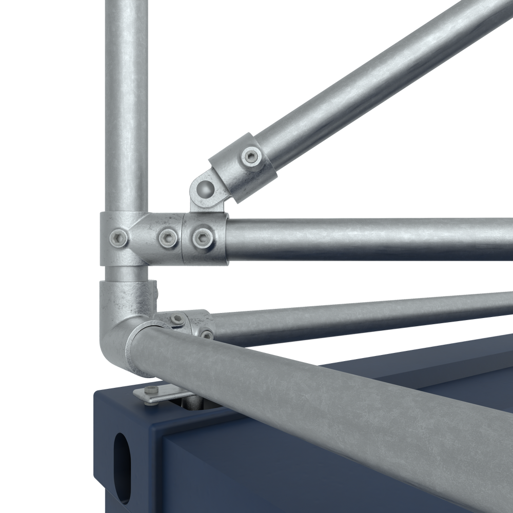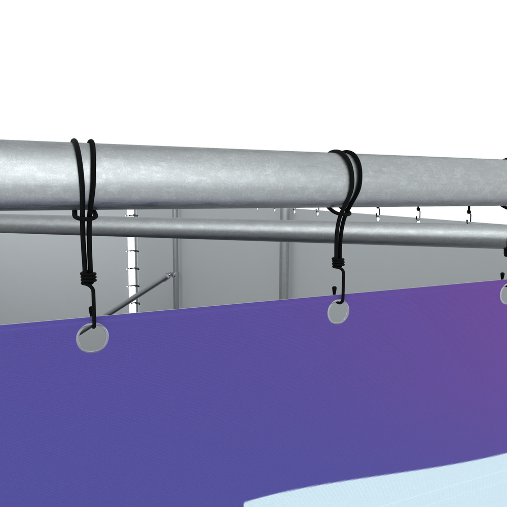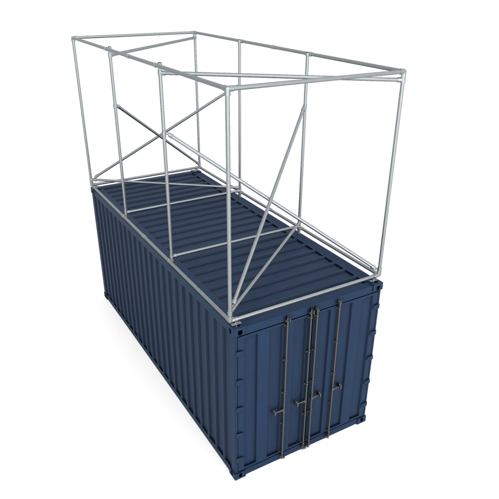 Dit frame is geschikt voor een 20ft container De doeken zijn aan alle zijden van de container zichtbaar. Dit frame is vervaardigd uit 48,3mm aluminium buizen en koppelingen en wordt geleverd met bevestigingsmateriaal. Binnenmaten Frames: 2 stuks van: 580x274cm & 2 stuks van: 238x274cm. Spandoekmaten: 2 stuks van: 564x258cm & 2 stuks van: 222x258cm.