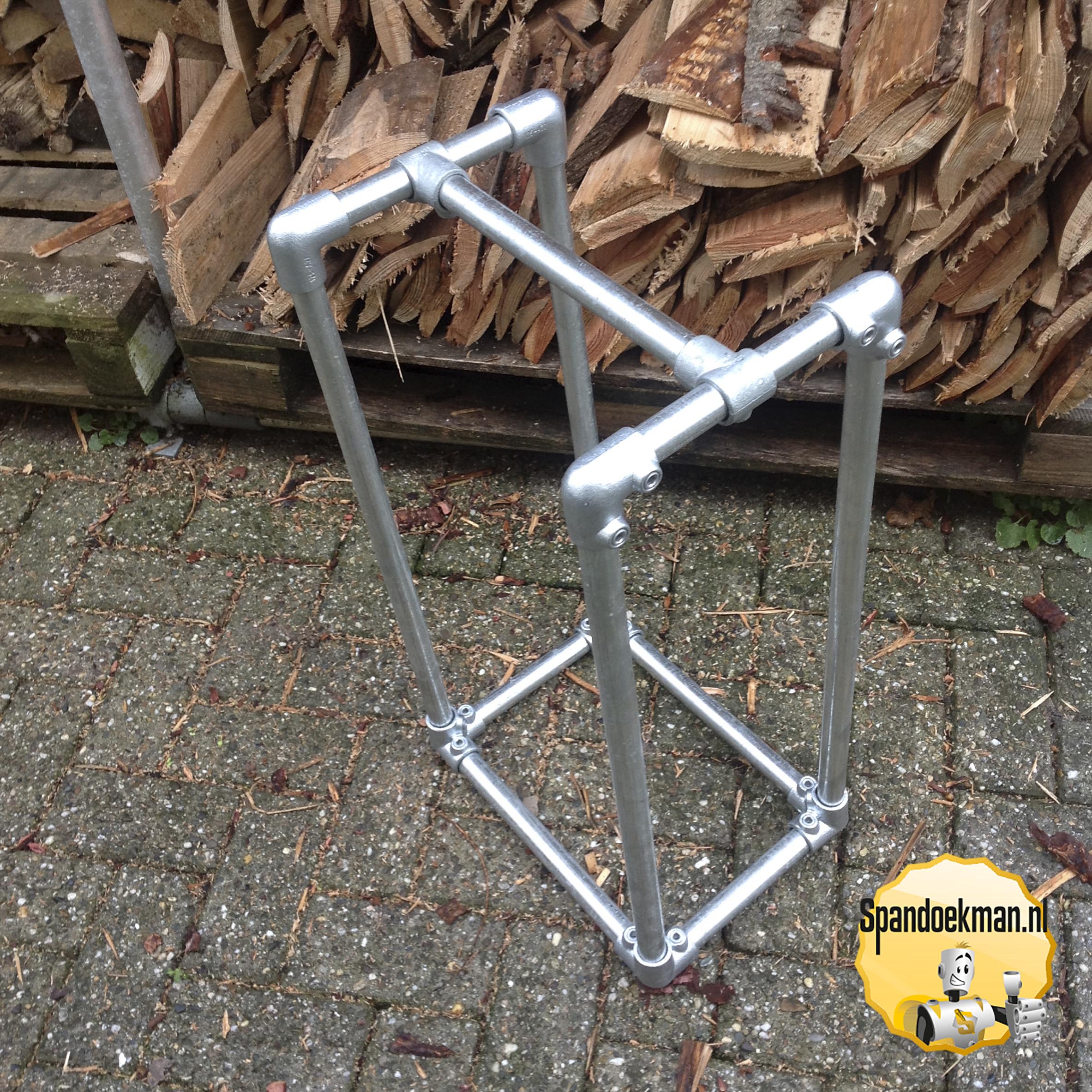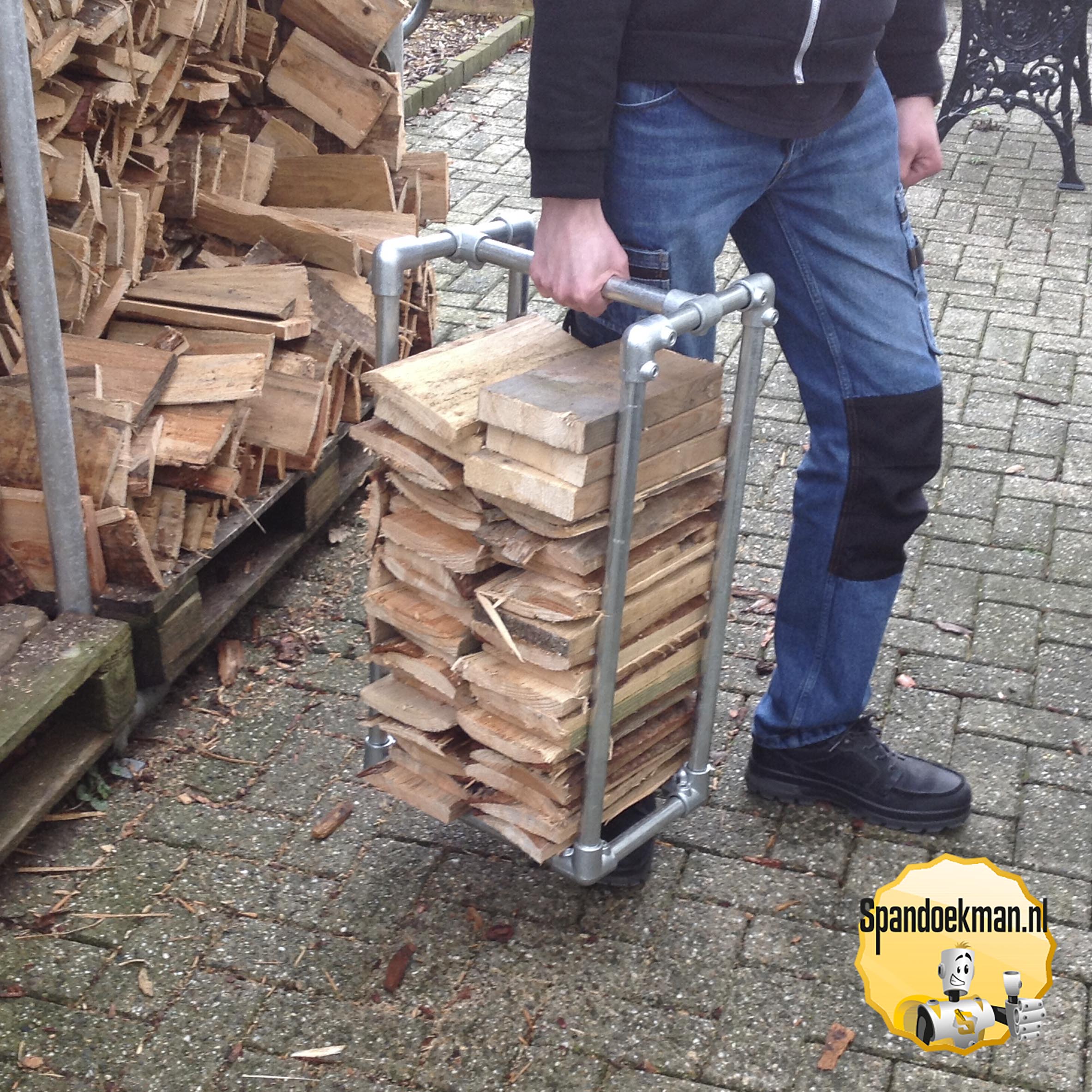 Haardhout opslag rek gemaakt van steigerbuizen en buiskoppelingen. Ideaal voor in de huiskamer naast de openhaard of om je houtblokken naar de juiste locatie te verplaatsen.
