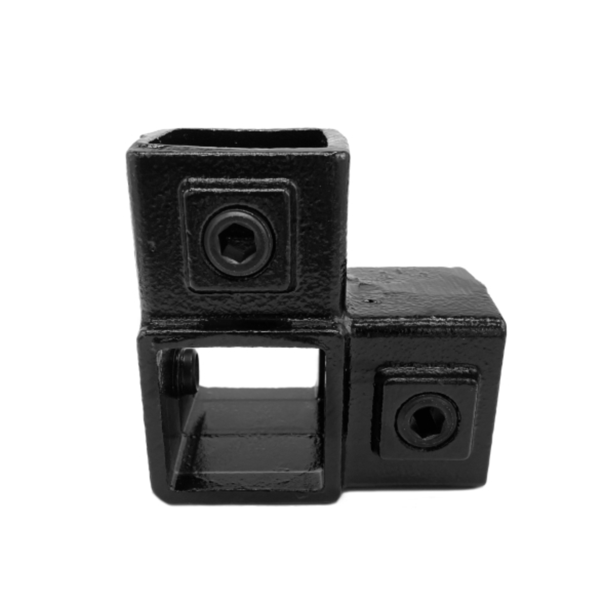 Zwarte vierkante hoekverbinding (90°), waarbij de verticale buis door de klem loopt. Geschikt voor zwarte vierkante steigerbuis van 40x40mm.