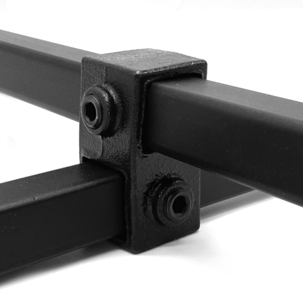 Deze zwarte vierkante buiskoppeling is ontworpen om een 90 graden kruisverbinding te maken en wordt veelal gebruikt bij relingwerk waar een doorlopende horizontale buis is gebruikt. In deze koppeling kunnen buizen niet met elkaar verbonden worden. Ze kan ook gebruikt worden om tussenliggende niveaus in onder andere magazijnstellingen te maken, indien horizontale verbindingen tussen de staanders onderling in de sectie niet nodig zijn. Geschikt voor zwarte vierkante steigerbuis van 25x25mm.