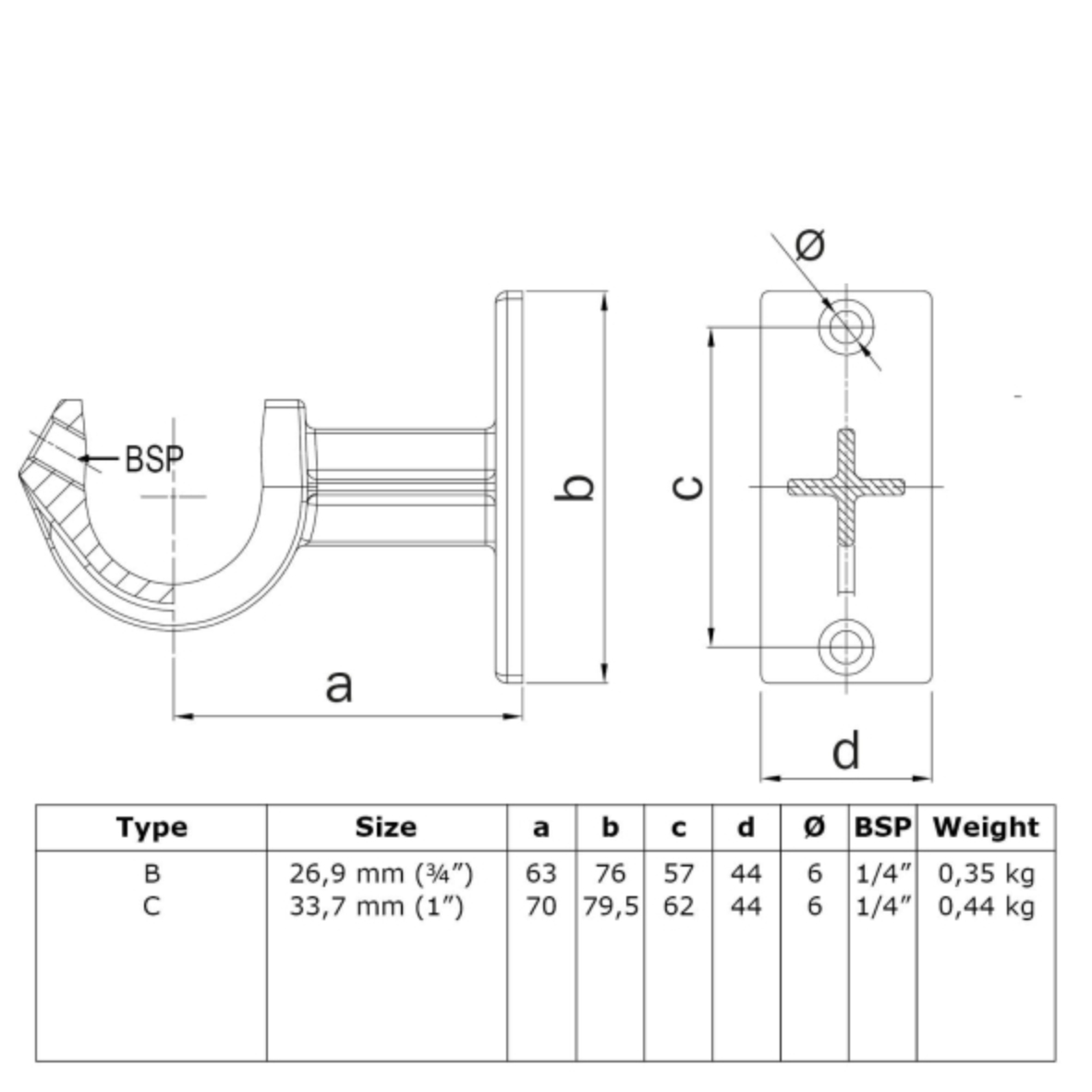 Dit type buiskoppeling is ontworpen om buizen op een vaste afstand langs een wand te bevestigen met de mogelijkheid voor een extra buis achterlangs. De buis gaat door de koppeling en kan niet in de koppeling doorverbonden worden. De voet is voorzien van 2 bevestigingsgaten. Deze buisklem wordt vaak gebruikt als reclameframes 's-avonds verwijderd moeten kunnen worden. Voor gebruik binnen en buitenshuis!