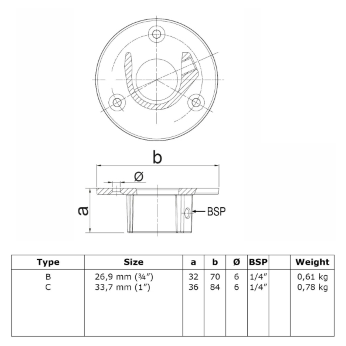 Deze open ronde voetplaat wordt gebruikt voor het ondersteunen van buizen voor kleding, het maken van gordijnroedes en voor het snel openen en afdichten van doorgangen in relingen langs verdiepingsvloeren voor het laden en lossen van pallets. Deze buiskoppeling heeft 3 bevestigingsgaten om de voetplaat stevig vast te zetten.Diameter: | 26,9mm |
