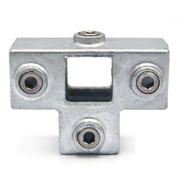 Deze vierkante buiskoppeling T-stuk met zij-uitgang type 24S. De koppeling is bedoeld voor 4 steigerbuizen, waarbij de horizontale buis in zijn geheel door de klem loopt. Geschikt voor een vierkante steigerbuis van 25x25mm.