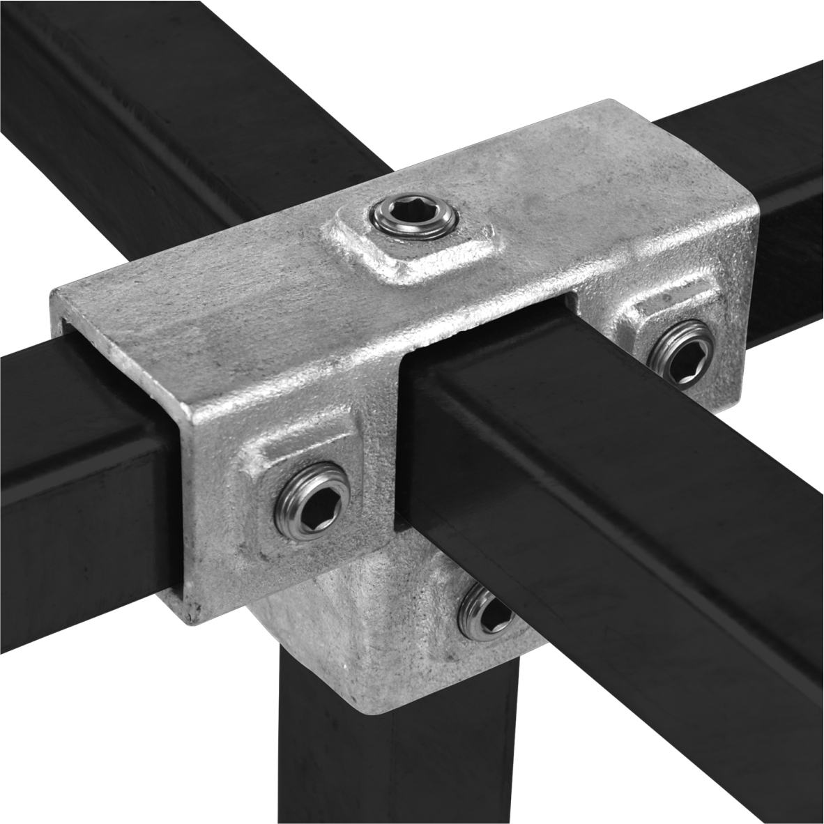Deze vierkante buiskoppeling T-stuk met zij-uitgang type 24S. De koppeling is bedoeld voor 4 steigerbuizen, waarbij de horizontale buis in zijn geheel door de klem loopt. Geschikt voor een vierkante steigerbuis van 40x40mm.