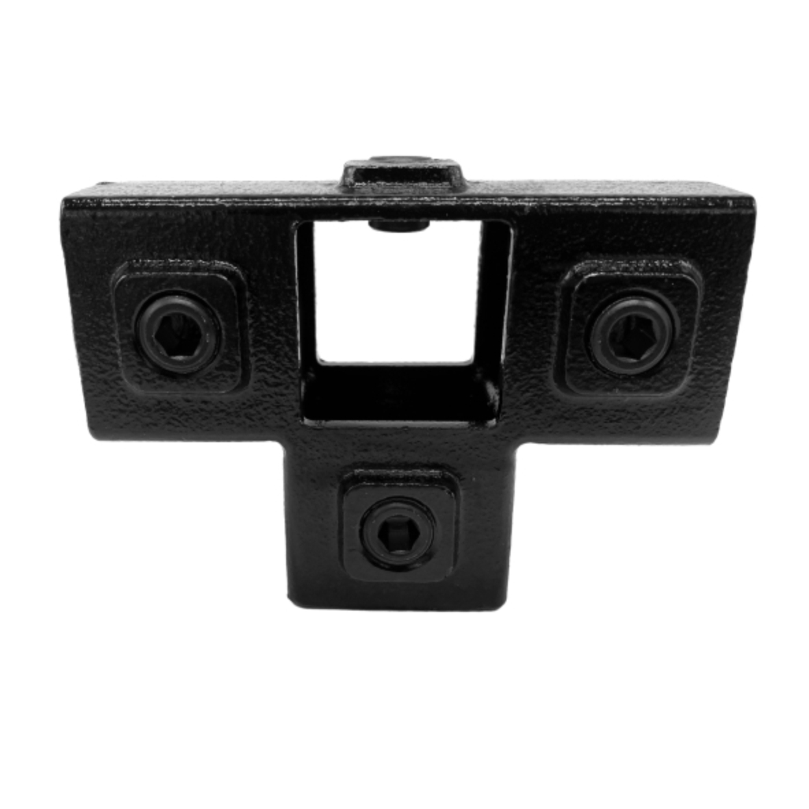 Deze zwarte vierkante buiskoppeling T-stuk met zij-uitgang type 24S. De koppeling is bedoeld voor 4 steigerbuizen, waarbij de horizontale buis in zijn geheel door de klem loopt. Geschikt voor zwarte vierkante steigerbuis van 40x40mm.