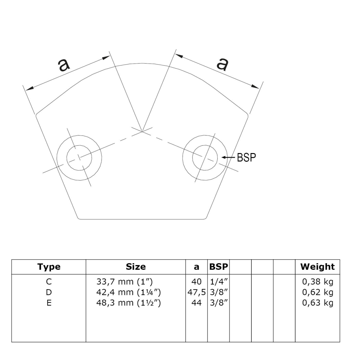 Elleboogkoppeling als eindstop voor de bovenreling met een variabele hoek van 15 tot 60 graden. Wordt meestal gebruikt bij verticale staanders voor trappen.| Diameter: | 33,7mm |