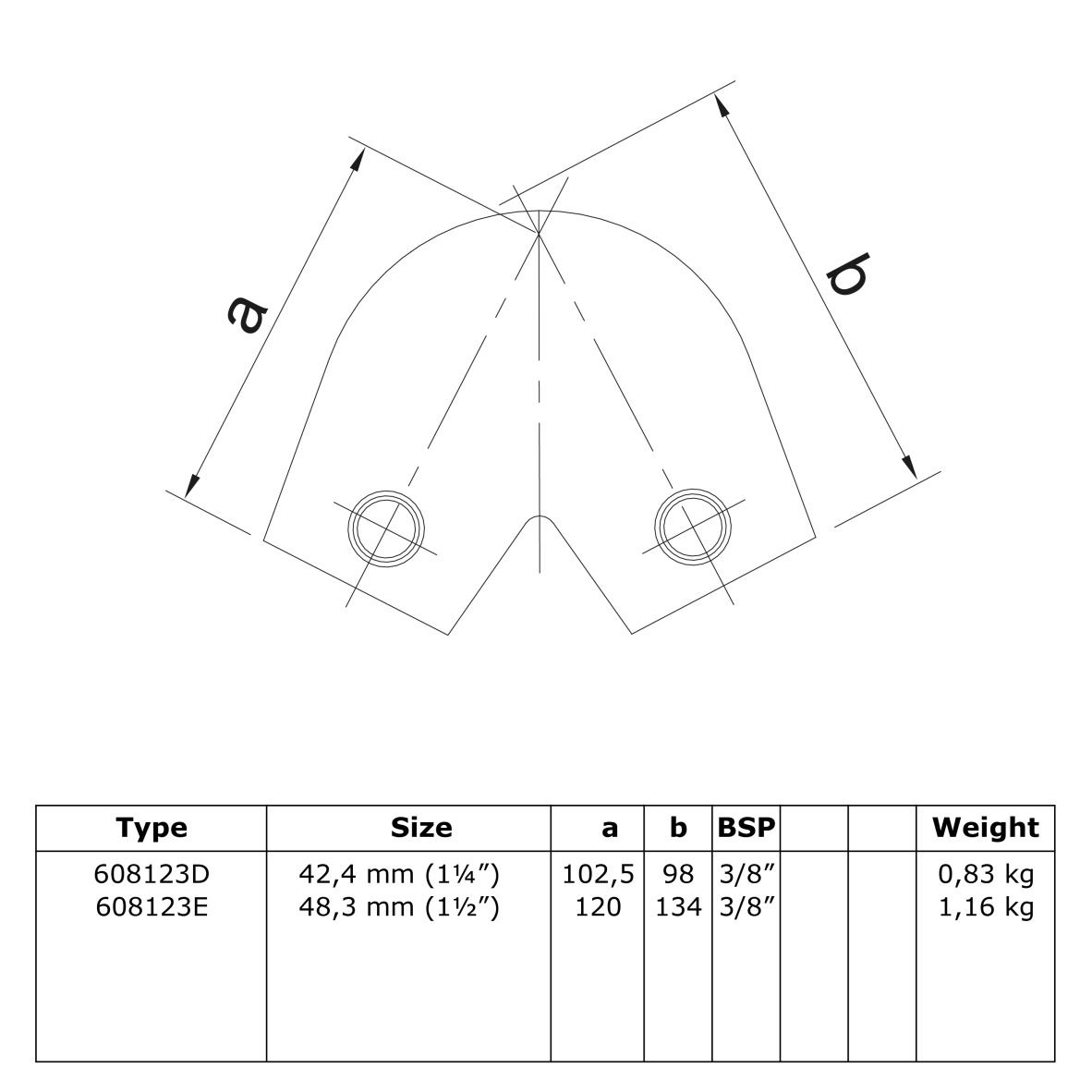 Elleboogkoppeling als eindstop voor de bovenreling met een variabele hoek van 40 tot 70 graden. Wordt meestal gebruikt voor leuningen bij trappen.| Diameter: | 48,3mm |